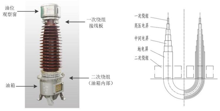 倒立式電流互感器外觀與內部結構示意圖